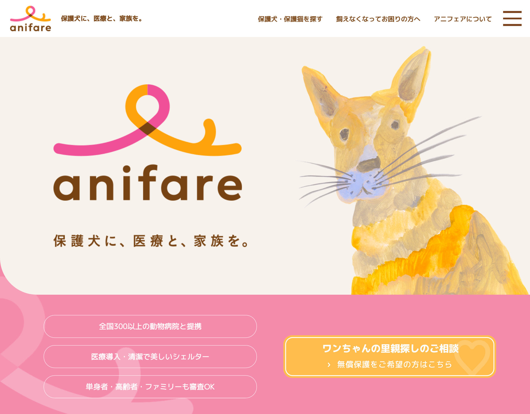 ・“anifare”에 대하여 수의사가 승인한 위탁부모 모집 사이트입니다 동물병원에서 건강검진을 실시하고, 분만 시 사육 조언을 제공하여 동물의 건강상태를 정확하게 판단함으로써 동물과 인간이 평생 행복하게 함께 살아갈 수 있는 시스템 구축을 목표로 합니다 애니페어는 동물복지(Animal Welfare)라는 단어에서 유래되었습니다URL: