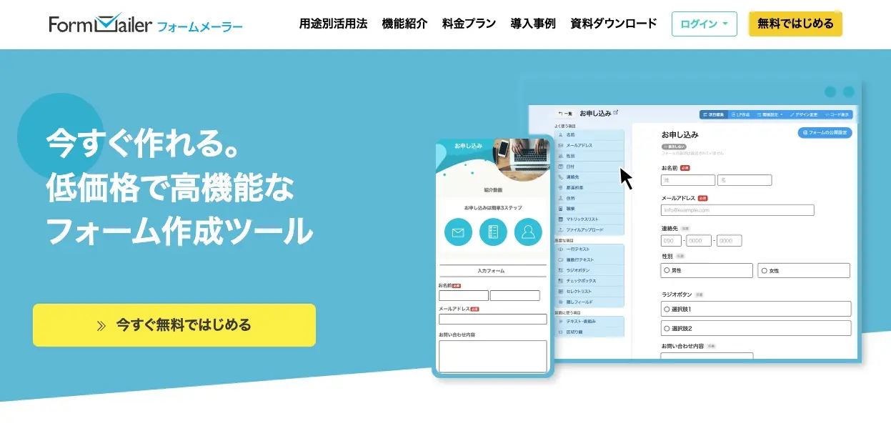 ・신청, 문의, 설문조사, 주문 등 다양한 양식을 쉽게 생성하세요 랜딩페이지(LP) 및 홈페이지 제작도 가능합니다・PayPal 결제 기능 지원(온라인 결제)・스마트폰에서 최적의 디스플레이를 자동으로 지원 ・SSL 암호화 통신 및 스팸 게시 방지 기능 지원・고유 도메인 지원 〈Formmailer 공식 홈페이지〉 〈용도별 사용〉